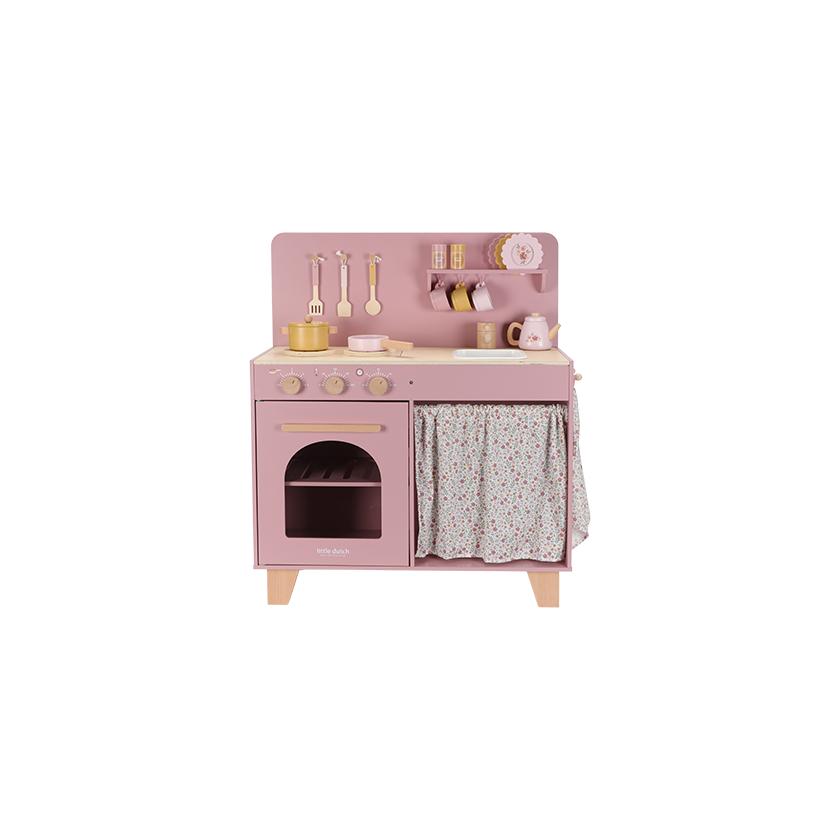 Ροζ ξύλινη κουζίνα με αξεσουάρ παιχνιδιού