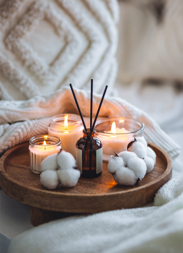 Καμία διακόσμηση δεν είναι ολοκληρωμένη χωρίς αρώματα που “αγκαλιάζουν” τον χώρο. Τα κηροπήγια σε γυάλινο δοχείο από το Domus Homus και ένα Stick αρωματικό χώρου με άρωμα βανίλια – Μασούτης – φέρνουν cozy vibes και γλυκιά ζεστασιά στις δροσερές φθινοπωρινές βραδιές στο σπίτι.