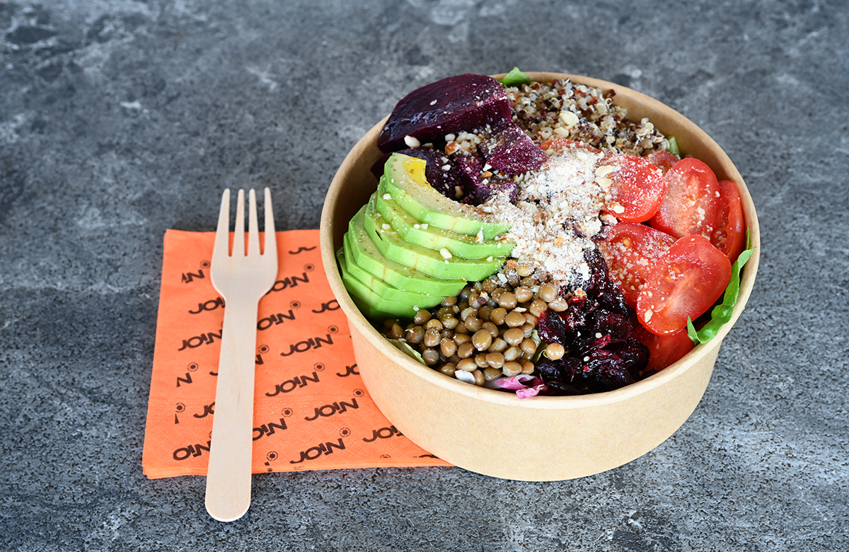 Ανάλαφρες, δροσερές και πλούσιες σε θρεπτικά συστατικά, οι φρέσκες σαλάτες όχι μόνο μας χορταίνουν, αλλά είναι ευεργετικές για την υγεία μας. Στο Join Healthy Food & Juice Bars, η Veggie Bowl σαλάτα ενσωματώνει αβοκάντο, τρίχρωμη κινόα, τοματίνια, παντζάρι, φακές, cranberries και αμύγδαλα, δημιουργώντας ένα πιάτο γεμάτο χρώματα και γεύσεις. Mini mozzarella, τοματίνια, χειροποίητο pesto βασιλικού και ντακάκια χαρουπιού ενώνονται στη σαλάτα Valeriana – Falafel – που συνοδεύεται από χειροποίητες sauce guacamole, mayo vegan truffle, pesto βασιλικού και τζατζίκι, προσφέροντας μία πλούσια γευστική εμπειρία.