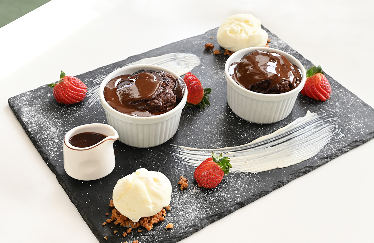 For something more refined, Evans’ Chocolate Soufflé with bitter chocolate sauce, hazelnut crumble and Madagascar vanilla ice cream offers the perfect balance between intensity and elegance. It’s the kind of dessert that turns a romantic dinner into a full sensory experience.